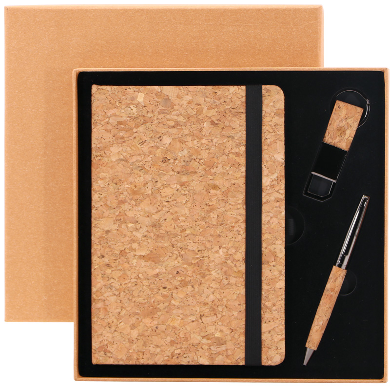 Gift Set with A5 Cork Notebook,Cork+Metal Ballpen&Keychain,96sheets 70grams Cream Papers with Black Lines